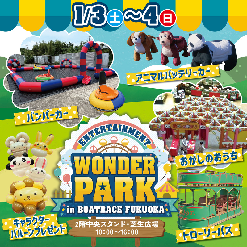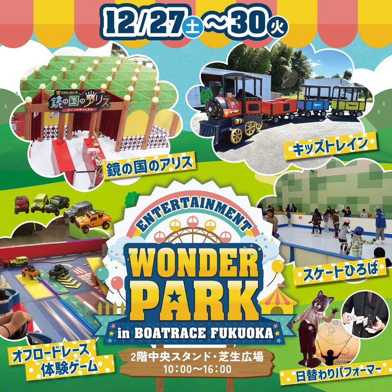 年末年始はボートレース福岡が遊園地に!! 家族連れで楽しめるイベント盛りだくさん! 日 程:12月27日(土曜日)~30日(火曜日) 1月3日(土曜日)~4日(日曜日) 場 所:ボートレース福岡 芝生広場等 時 間:10:00~16:00 参加費:無料 対 象:小学生以下のお子さま ※わくわくスケート広場のみ4歳から12歳が対象