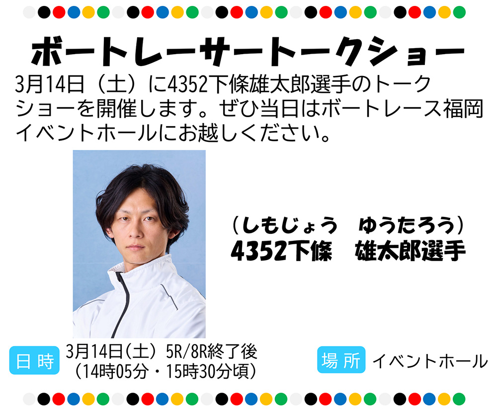 福岡県知事杯争奪福岡都市圏開設36周年記念競走5日日の3/14(土)に4352 下條雄太郎 選手(長崎支部)のトークショーを開催します! 日程 : 3月14日(土曜日) 場所 : ボートレース福岡 イベントステージ 時間 : 5レース、8レース終了後(午後2時05分頃、午後3時30分頃) ぜひボートレース福岡へお越しください♪