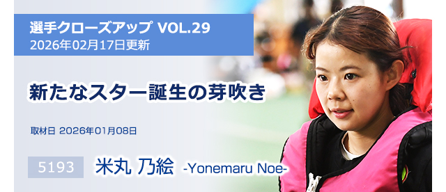 また一人福岡からスターが誕生しようとしている。その名は米丸乃絵。2026前期勝率は自己最高勝率となる6.61をマークしてA1級に初昇格。2026年のトップルーキーに福岡支部から唯一選出されて、今後はSG、GⅠ戦線での活躍も期待されるが、ここまでの道のりはそこまで簡単なものではなかった。米丸は128期生だが養成所時代は、コロナ禍の真っただ中。養成所の課程で訓練生が最も伸びるとされる現役選手を招いての選手招聘訓練がコロナ禍で中止となり、通常とは違うカリキュラムでデビューを迎えることに。「私たちは本当にレベルが低かったと思います。いきなりプロの先輩達の中に放り出されて、あまりのレベルの差に途方に暮れていました」