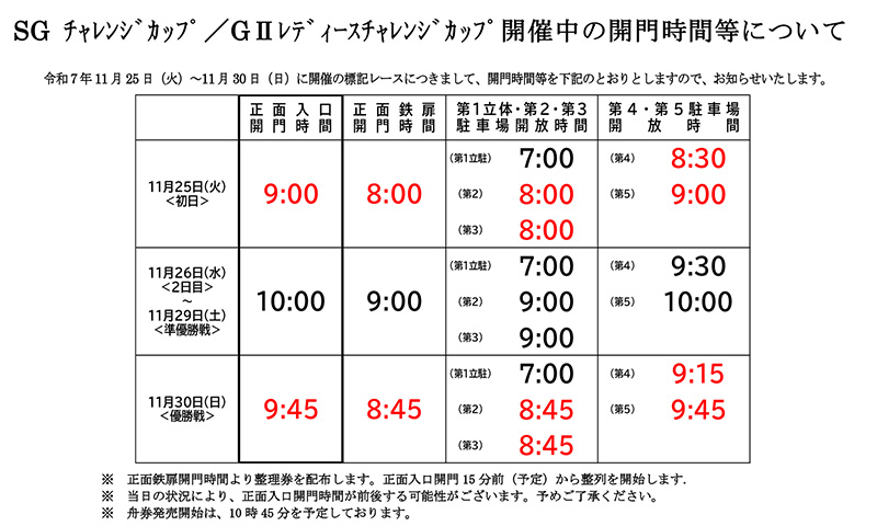 SGチャレンジカップ/GⅡレディースチャレンジカップ開催中の開門時間等について