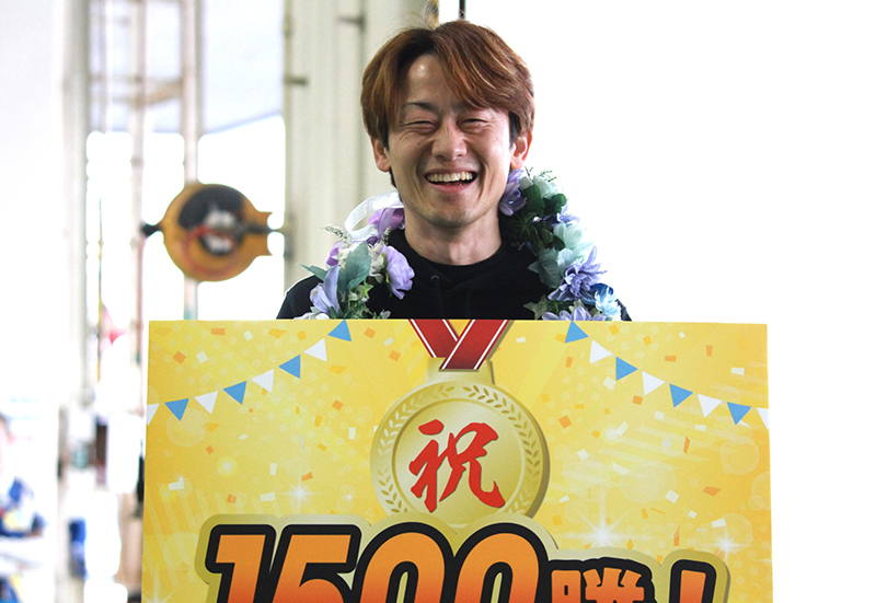 通算1499勝で今節を迎えた枝尾選手は、5日目第8レースでコンマ09でスタートし、大外6コースからまくりで1着をとって1500勝を達成。多くの地元福岡支部の選手や関係者に見守られながら、豪快に水面へ投げ込まれました。