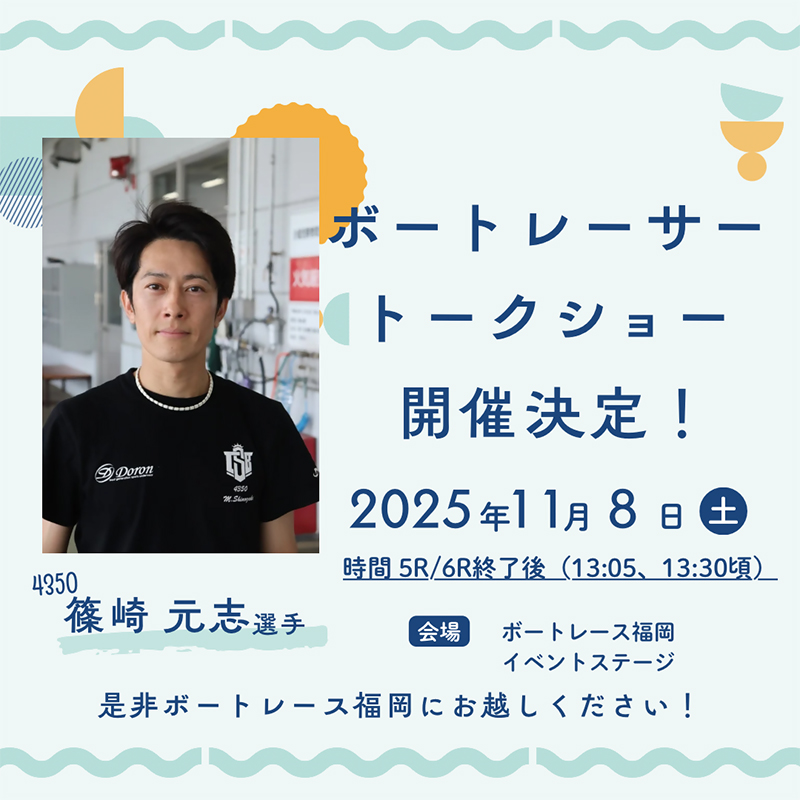11/25(土)~30(日)にボートレース福岡で開催されるSG第28回チャレンジカップへの出場が有力視される 4350 篠崎 元志 選手(福岡支部) のトークショーを開催します! 日程 : 11月8日(土曜日) 場所 : ボートレース福岡 イベントステージ 時間 : 5レース、6レース終了後(午後1時05分頃、午後1時30分頃) ぜひボートレース福岡へお越しください♪