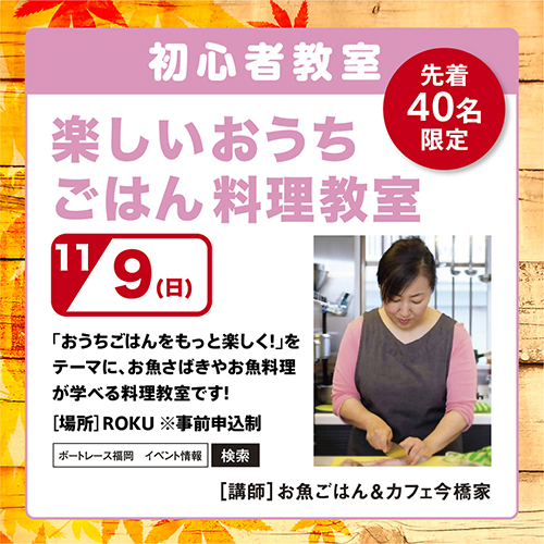 11月9日(日曜日)は、ボートレース福岡で、料理教室を開催します!