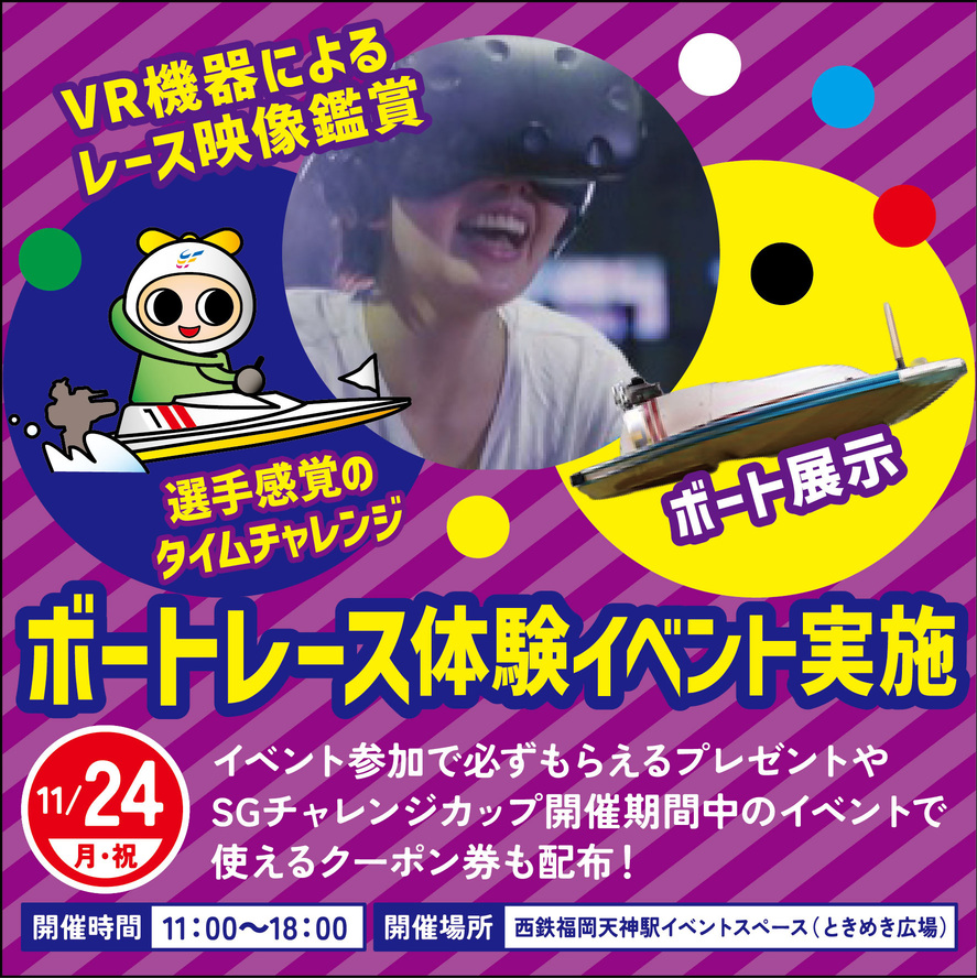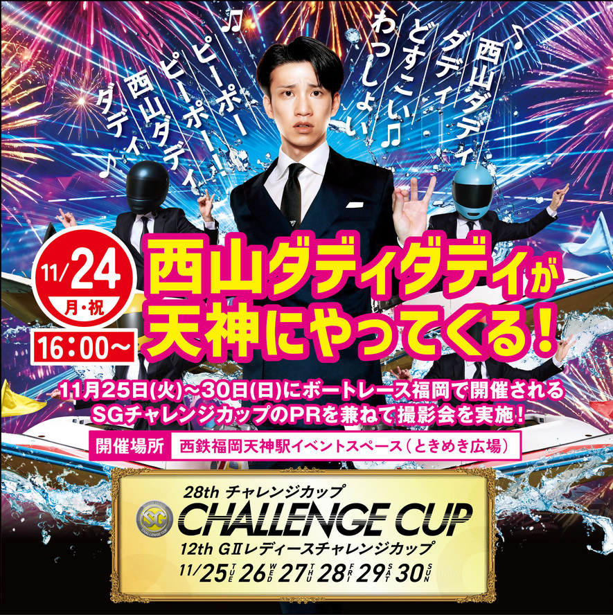 SGチャレンジカップの開催告知として西鉄天神(福岡)駅でPRブースを出展!西山ダディダディとの撮影会や推しレーサーカードの配布を行います! 日程 :11月24日(月曜日) 場所 :西鉄福岡(天神)駅きらめき広場 時間 :11:00~18:00 西山ダディダディ撮影会:16:00~