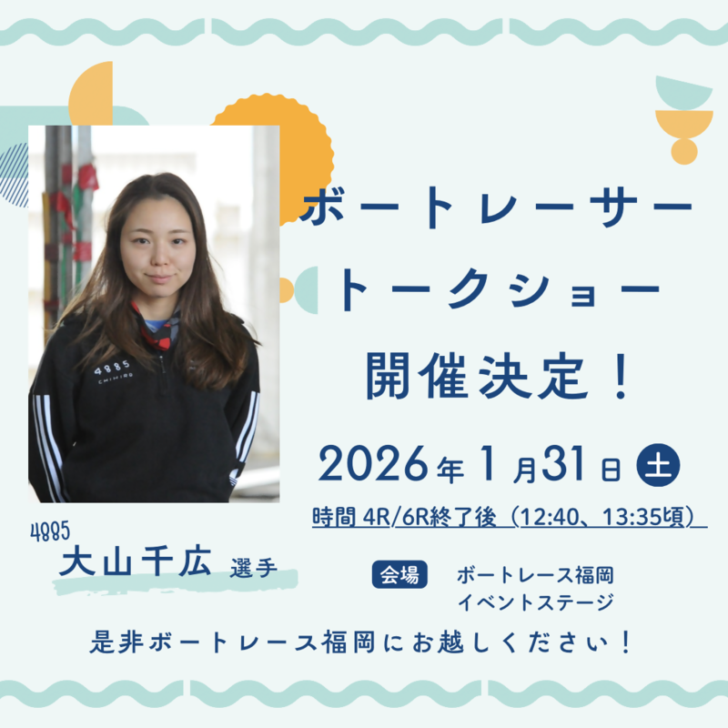 和風ダイニングかっぱドリーム杯最終日の1/31(土)に4885大山千広選手(福岡支部)のトークショーを開催します! 日程:1月31日(土曜日) 場所:ボートレース福岡 イベントステージ 時間:4レース、6レース終了後(午後0時40分頃、午後1時35分頃) ぜひボートレース福岡へお越しください♪