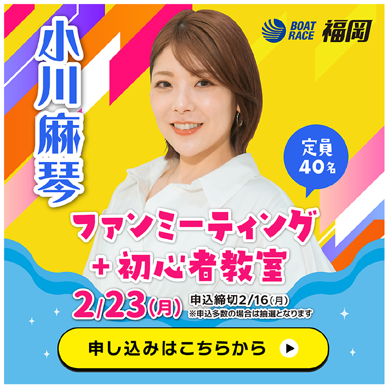 元モーニング娘。小川麻琴さんによるファンミーティング+ボートレース初心者教室を開催します。 開催日時:2月23日(月祝)13時~15時頃 開催場所:特別観覧施設ROKU 募集定員:40名 申込締切:2月16日(月) ※申込多数の場合は抽選となります。 お申込みはこちら