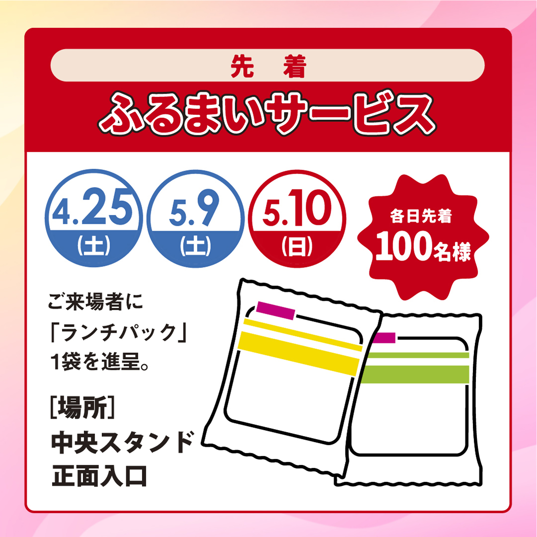 本場へ来場された方へ先着で「ランチパック」をプレゼントします! 日程:4月25日(土曜日) 5月9日(土曜日)から10日(日曜日) 場所:ボートレース福岡 中央スタンド正面入口 時間:開門(11時)から無くなり次第終了