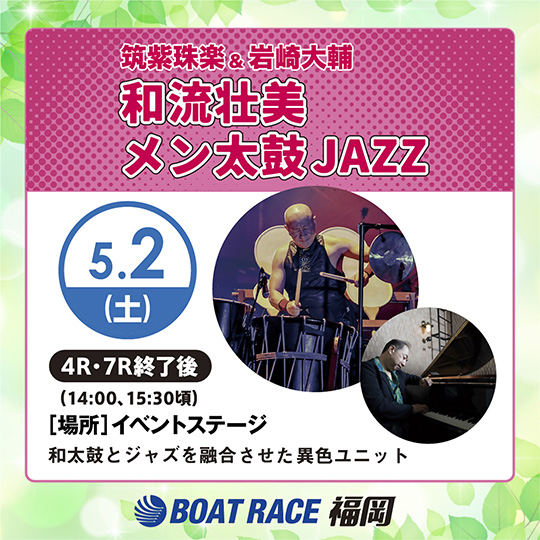 和太鼓とジャズを融合させた異色ユニットのショーをを実施します! 日程:5月2日(土曜日) 場所:ボートレース福岡 イベントステージ 時間:4レース、7レース終了後(午後2時00分、午後3時30分頃)