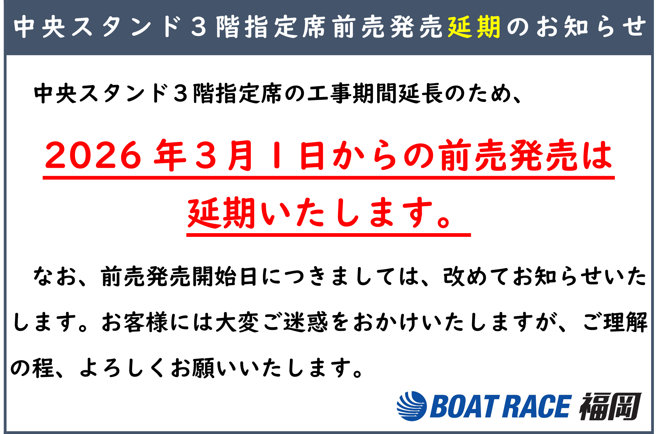 中央スタンド3階指定席前売発売延期のお知らせ