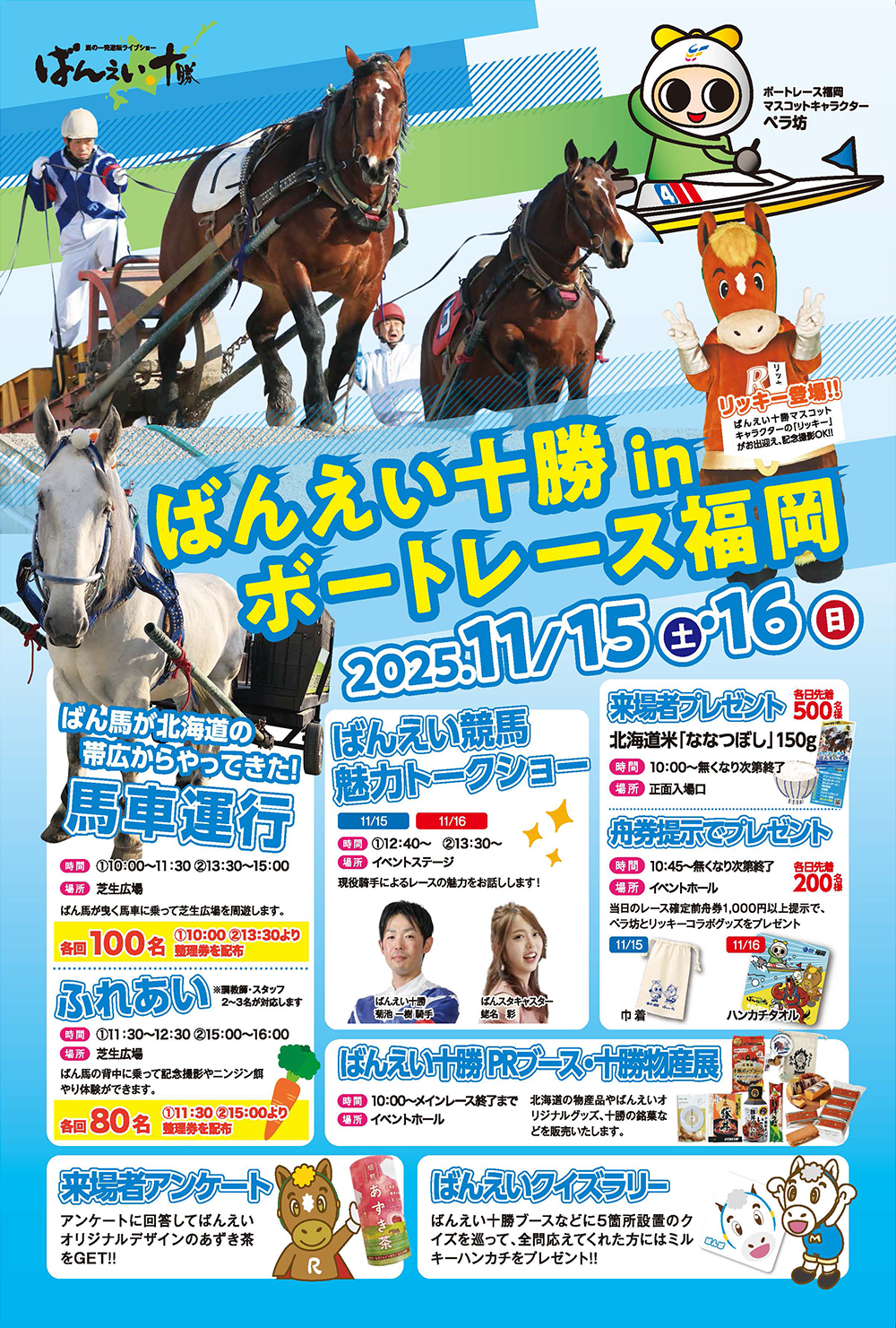 内容:当日の未確定舟券1,000円以上の提示で、「ペラ坊」とばんえい十勝キャラクター「リッキー」コラボグッズを各日先着200名様にプレゼントします。※お一人様1回まで