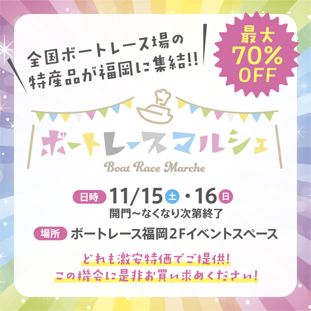ボートレースの社会貢献事業の一環として、「ボートレースマルシェ」を開催します! 全国のボートレース場がある地域の特産品を特別価格で購入できます。 商品が無くなり次第終了となりますので、予めご了承ください。 皆さまのご来場を心よりお待ちしております♪ 日程:11月15日(土曜日)、11月16日(日曜日) 場所:ボートレース福岡 中央スタンド2階イベントスペース 時間:午前10時から、無くなり次第終了
