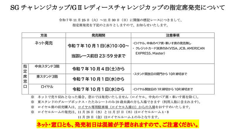 SGチャレンジカップ/GⅡレディースチャレンジカップの指定席発売について